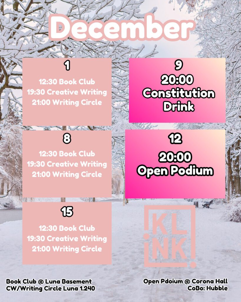 Every Monday from 19:30 to 20:30, KL!NK hosts a Creative Writing session. During these sessions, we do not care about quality; we just WRITE! If you want to give it a try, just walk in, you do not need to sign up. For more long-term projects, we also have a writing circle to help you write your dream novel.